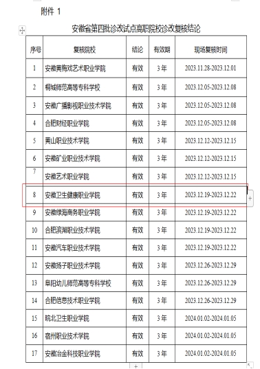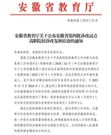 近日,省教育厅发布《安徽省教育厅关于公布安徽省第四批诊改试点高职院校诊改复核结论的通知》(皖教秘高〔2024〕33号),全省第四批职业院校诊改复核结果予以公布,我院顺利通过安徽省职业院校教学工作诊断与改进专家委员会专家组复核,诊改复核结论为“有效”。
